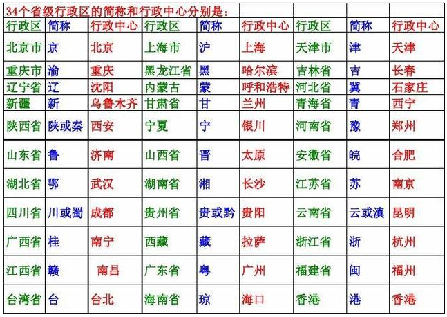中国共计34个省级行政区,其简称分别为:北京市(京)、天津市(津)、上海市(沪)、重庆市(渝)、河北省(冀)、河南省(豫)、四川省(川)、云南省(云)、辽宁省(辽)、黑龙江省(黑)、湖南省(湘)、安徽省(皖)、山东省(鲁)、江苏省(苏)、浙江省(浙)、江西省(赣)、湖北省(鄂)…