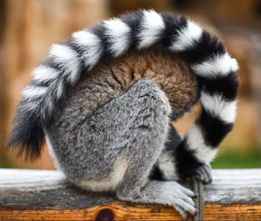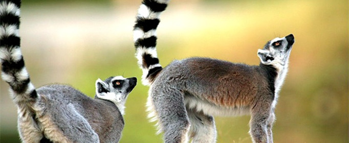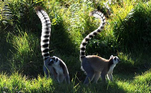 环尾狐猴属于原始灵长类,吻长、两眼侧向似狐,因尾具环节斑纹而得名。多5-20成群,栖多石少树的干燥地区,各有自己的领域。善跳跃攀爬,是地栖性较强的狐猴,主食昆虫、水果。3岁性成熟,孕期约4个半月,多为双仔。繁殖期在哺乳动物中最短,每年仅两周,一只雌猴接受雄猴的时间不足一天。寿命约18年。