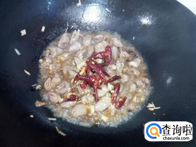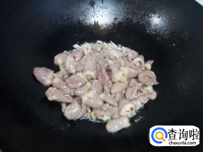 锅内放入油加热,油热后放入花椒,葱,姜,蒜,爆锅。放入鸡心翻炒。