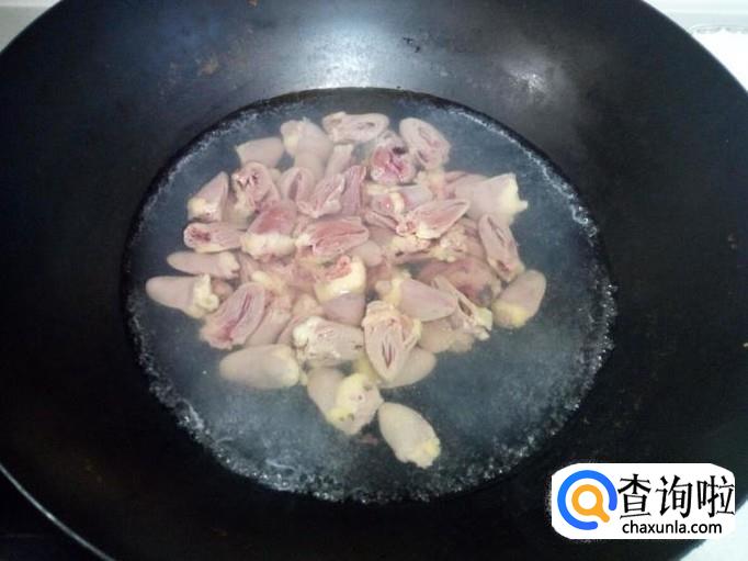 鸡心用开水焯一下,水开后入锅30秒钟捞出,用水冲洗干净上面的沫子和血水,淋干水分。