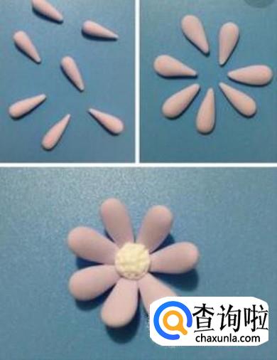 先做花瓣,捏小部分黏土放在手里捏成水滴状,然后用小圆棒将水滴状黏土压制成花瓣状。如此重复步骤,做出较多的花瓣来。