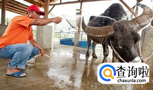 天气热的时候要经常给牛洗澡,牛是很怕热的,尤其是水牛,过热牛也是会生病的,所以洗澡很重要。