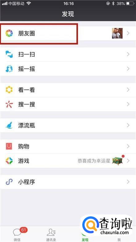 首先点击微信中的朋友圈,如下图所示。