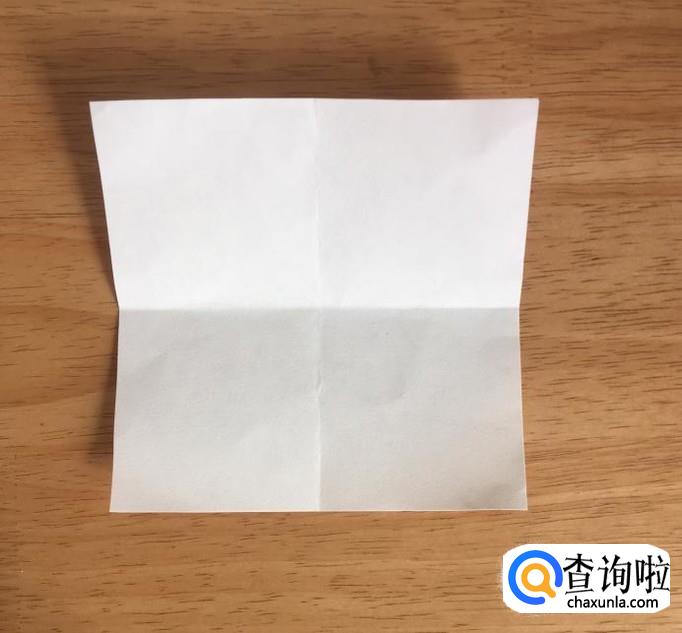 准备一张正方形彩纸,上下对折并展开,然后左右对折后打开。
