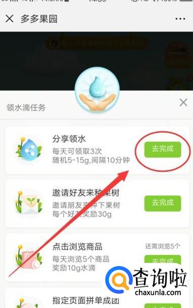 按着任务进行操作即可获得水滴,例如点击“分享水滴”,将水滴分享给好友,自己就可以得到一些水滴,如图所示。