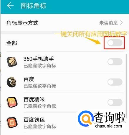 点击此项,然后在新的设置页面找到"图标角标"选项,进入到应用列表以后,我们可以一键全部将角标开关关闭,也可以有选择性的关闭,这样以后就不会再有应用数学提示了;