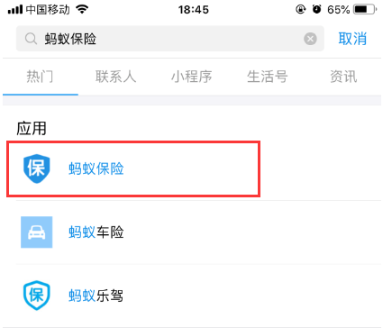 第二步、搜索蚂蚁保险,如图所示,点击打开应用界面。