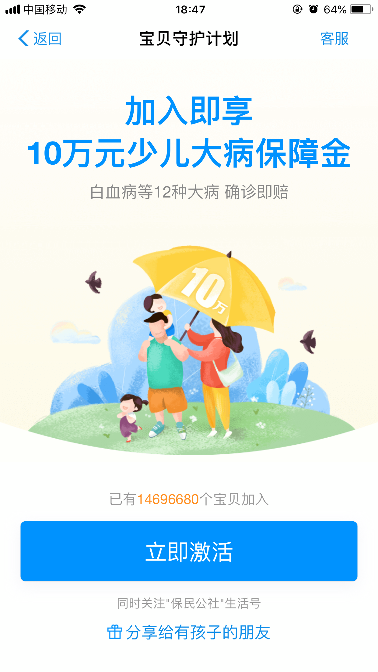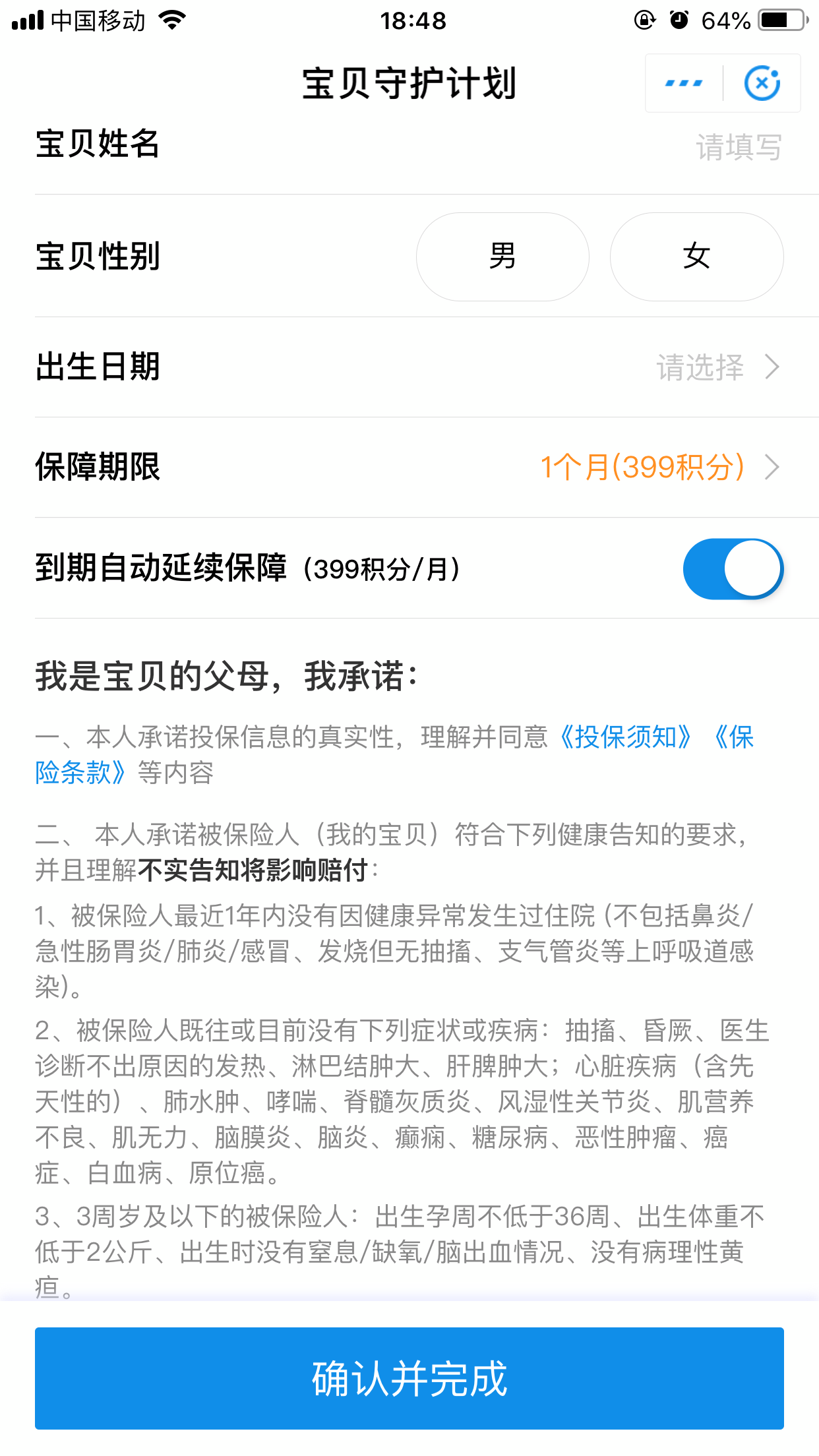 支付宝中有一个保险——宝贝守护计划,这个计划是对30天到17周岁的宝贝有效的。这一个关于疾病的保险,每月可以使用399蚂蚁积分购买。