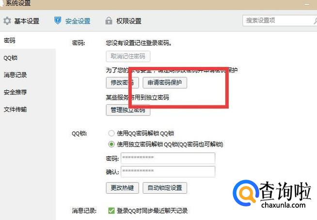我们点开QQ“设置”,找到“安全设置”,在“密码”这个版块里,我们看到有一个“申请密码保护”按钮,从这个按钮点击进去就可以设置密码保护。
