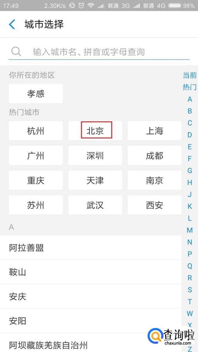 接下来,在出现的页面中,选择需要的城市或者在上面的搜索框中输入需要选择的城市,并点击选择确定。