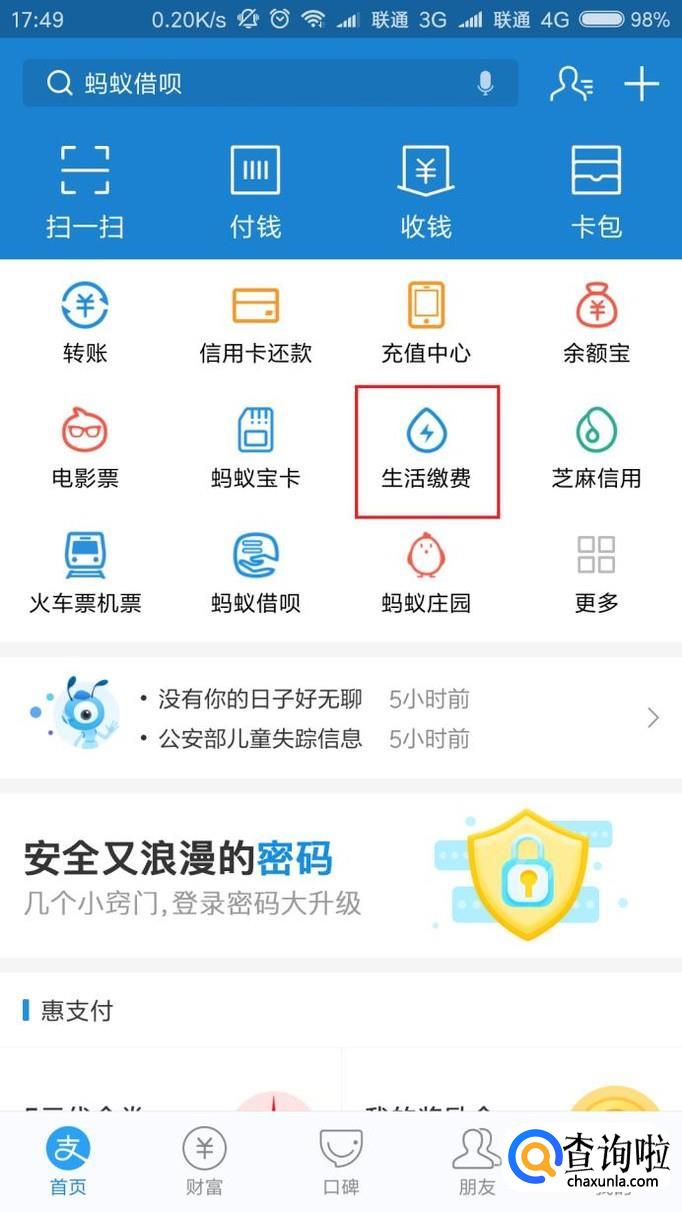 只有用到支付宝应用中提供的部分功能时,才需要进行位置地理信息的确定,这里以生活缴费服务为例,打开支付宝应用中的“生活缴费”服务菜单。