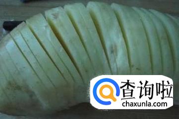 然后用刀按照四十五度左右的方向在一端切片,之后按照同样的方法在另一端也切片,使萝卜看起来就好似电话线一般可以连成一圈。