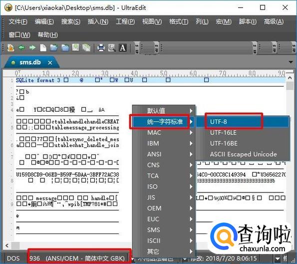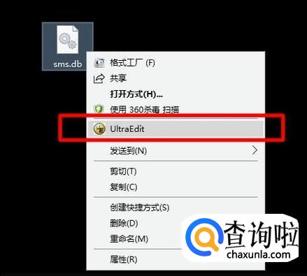 在网上搜索并下载UltraEdit软件,安装完成后,右击前面导出的sms.db文件,然后在弹出菜单中点击UltraEdit来使用UltraEdit打开sms.db文件。