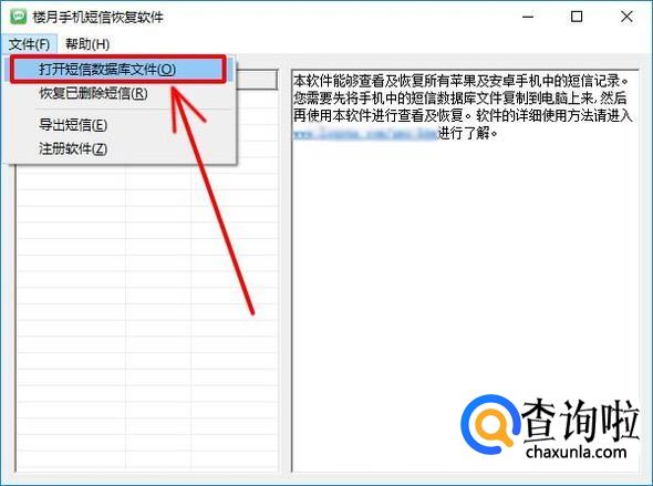 在电脑上安装并运行楼月手机短信恢复软件,点击“文件”,“打开短信数据库文件”来打开从手机上导出的sms.db文件。