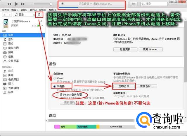 在电脑上安装并运行iTunes软件,按下图所示步骤,把手机上的全部数据都备份到电脑上。