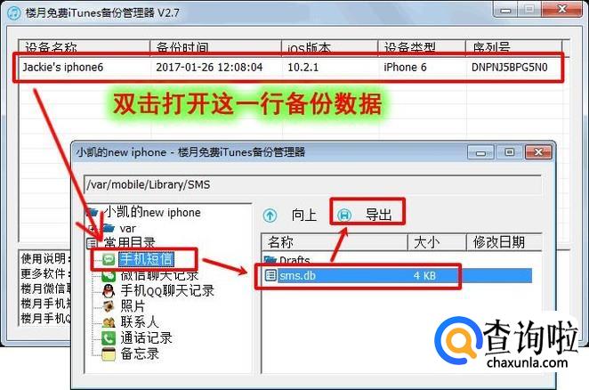 同方法一一样,先把iPhone手机连接到电脑上,再使用iTunes软件对手机数据进行备份,最后使用楼月免费iTunes备份管理器把sms.db导出到电脑上。在这里就不累述了,请查看上方的第1,2,3步即可。