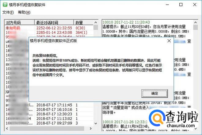 稍等几秒后,手机短信删除了怎么恢复的问题就解决了。在软件界面上,点击左边的手机号码列表,右边就会显示所有现存及恢复回来的短信内容及收发时间。