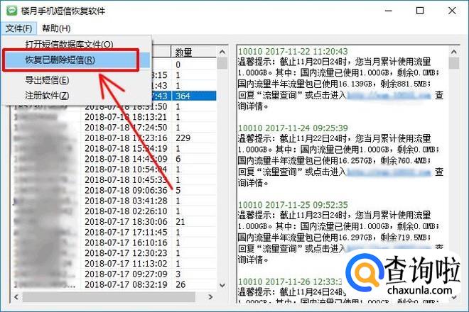 与所有手机号码往来过的短信内容,收发时间就都显示在了界面上,但这些都还是未删除的手机短信,接着请点击“文件”,“恢复已删除短信”菜单。