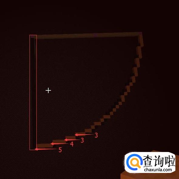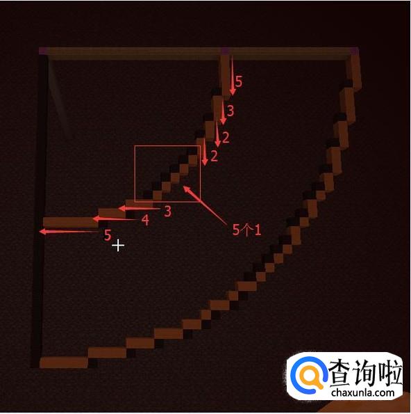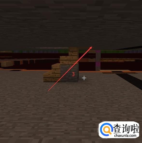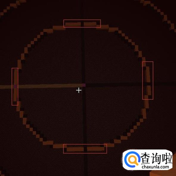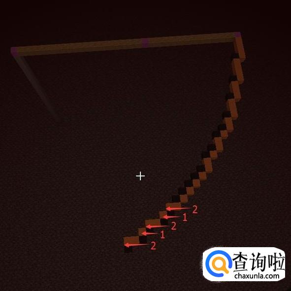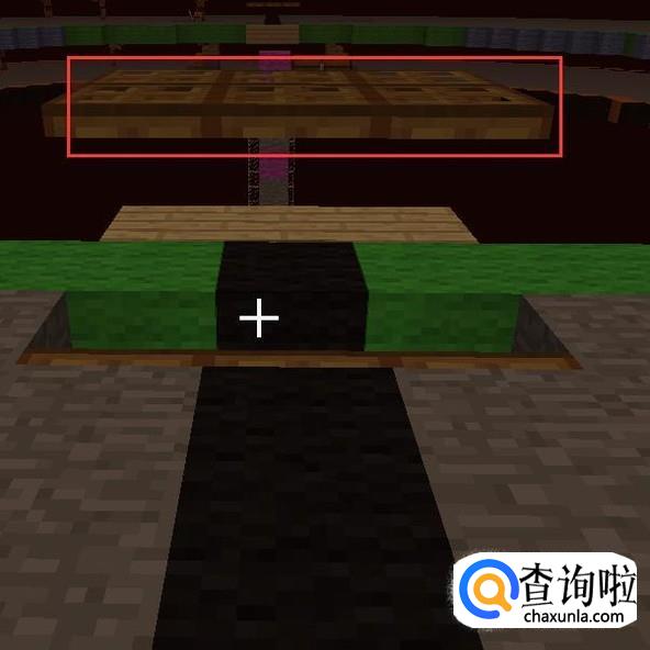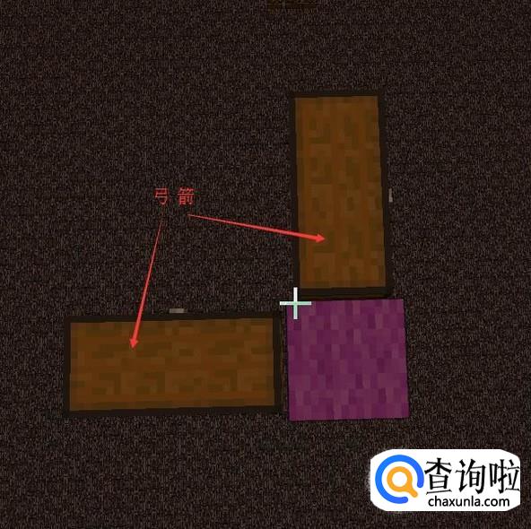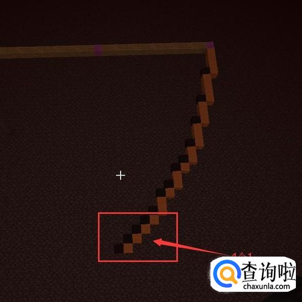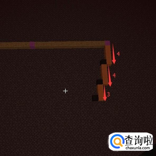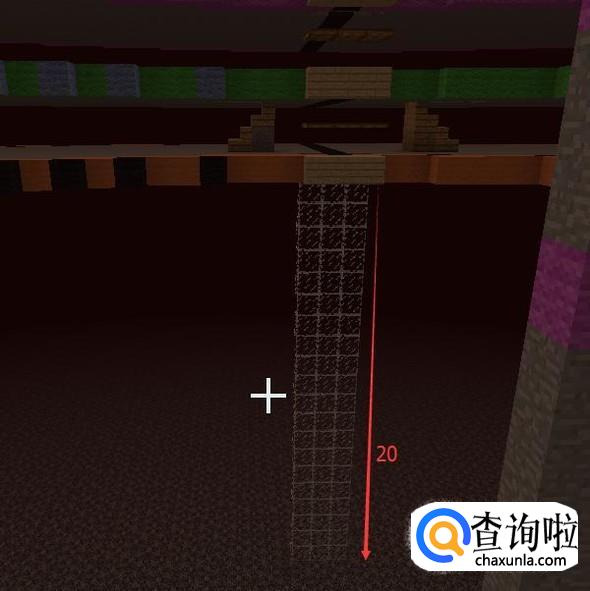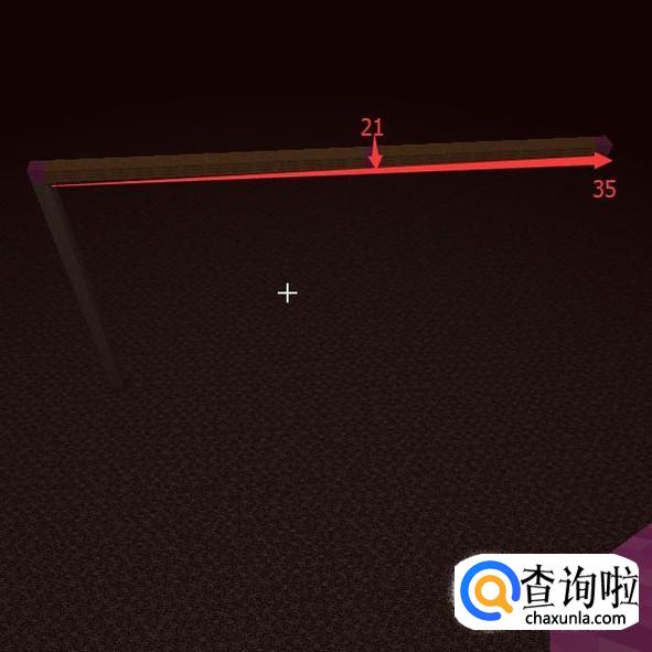 然后再提高一格,第26格高用【紫色羊毛】(中心点)表示,然后向一个方向放【木头】长21格。第21格用【紫色羊毛】替换掉。