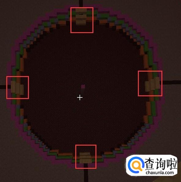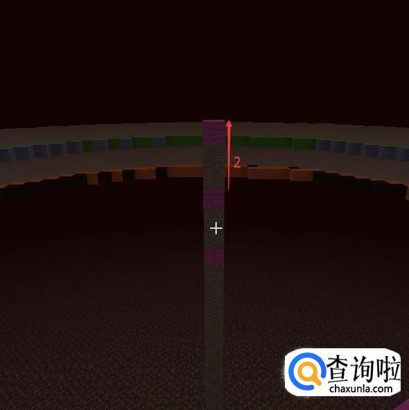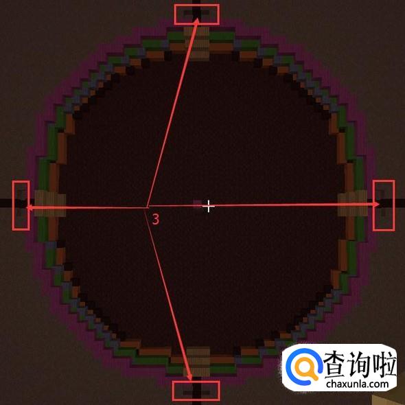 中心点再提高2格,第三格放【紫色羊毛】再通过紫色羊毛出发如法炮制的再做第三个外圈跟第三个内圈。同样填满石头后拆掉确定半径用的方块。