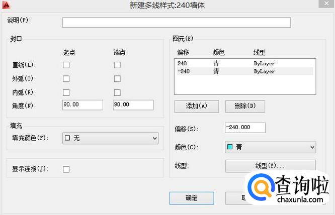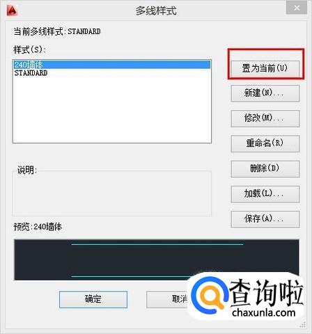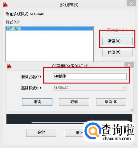 弹出多线样式编辑界面,点击新建,输入“240墙体”作为新样式名。