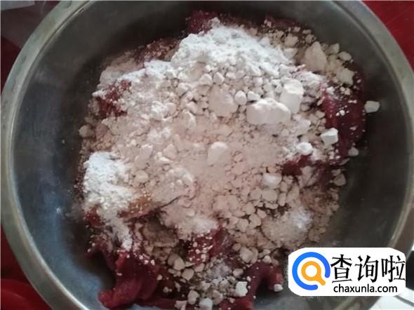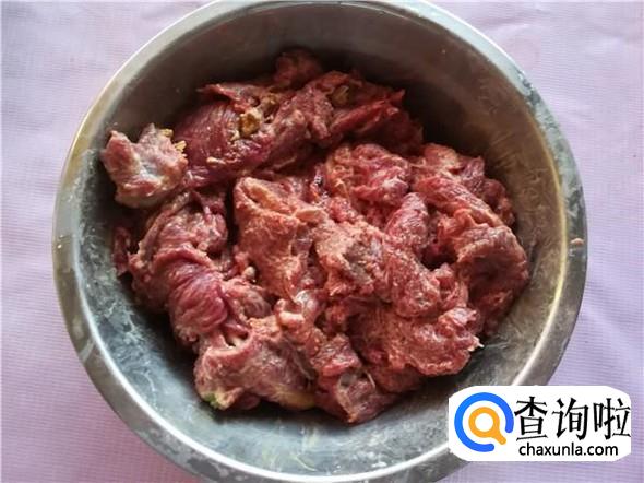 用手狠狠的将地瓜粉和牛肉揉捏一下,使牛肉和地瓜粉充分融合,此时要腌制十分钟。