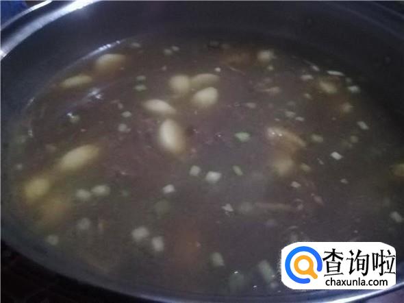 当水再次煮到沸腾,如果喜欢吃比较粘稠的牛肉羹的人可以倒入半碗生粉水,但是喵嗷家不喜欢粘稠的所以就不倒入了,就只倒入葱花和盐。