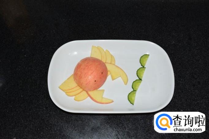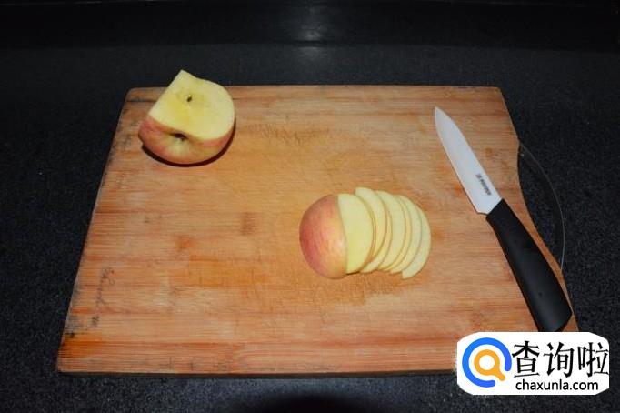 把中间的苹果梗部分切除,将果片切成锯齿状,螃蟹钳子就完成了。
