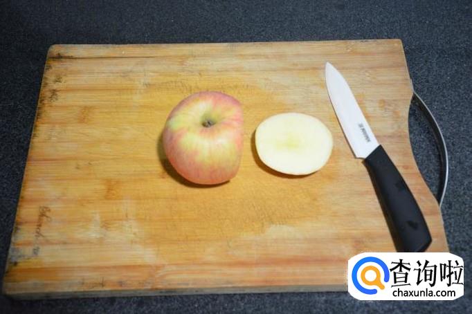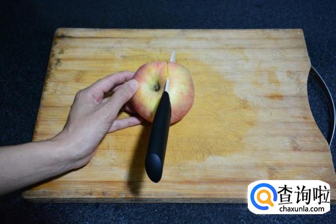 根据果盘大小,选择合适大小的螃蟹水果壳尺寸,自苹果一侧竖切一刀,螃蟹壳就完成了。