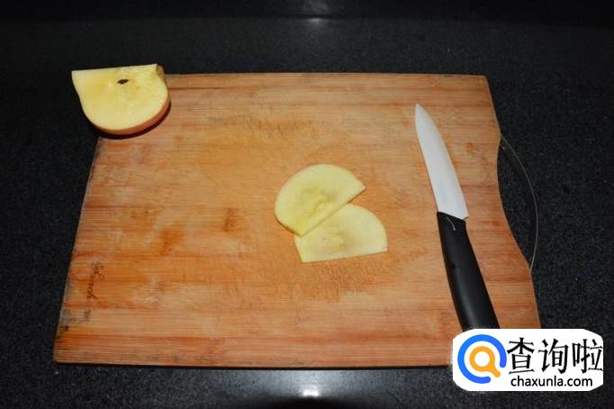 将苹果水平转动90度,再竖切一刀,尺寸计划好,这决定螃蟹脚的大小。