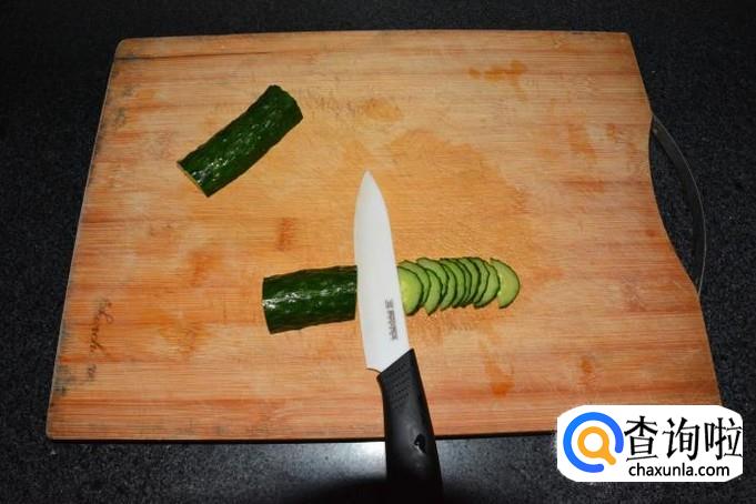 开始摆盘。先摆螃蟹脚,然后是螃蟹钳,最后盖上螃蟹壳,黑芝麻粒做眼睛,眼睛的角度稍向上斜,能显示出螃蟹的杀气腾腾。黄瓜作为海浪,先从靠近螃蟹处开始摆,成型后能显现出波浪腾腾、后浪推前浪的效果。