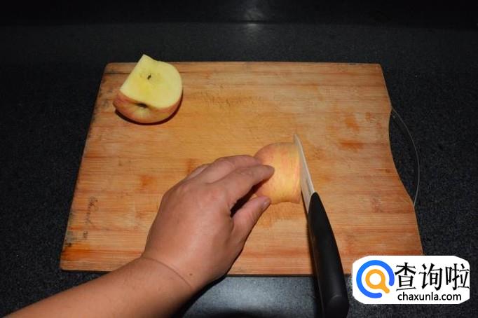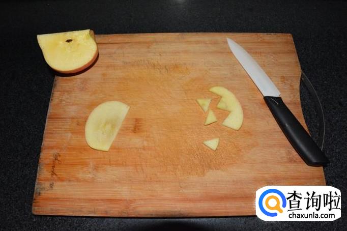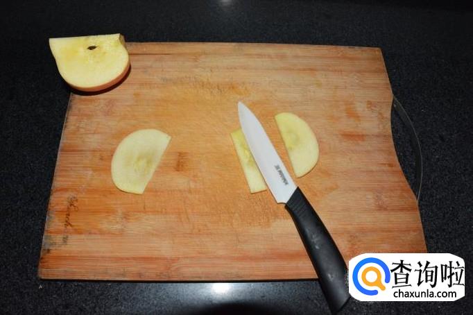 在已经切过的苹果上找最大的一面,切下两个大片,这是准备做螃蟹的钳子。