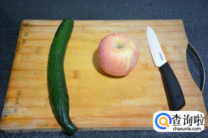 准备好一颗品相好的红苹果,黄瓜一根,水果刀一把,果盘,砧板