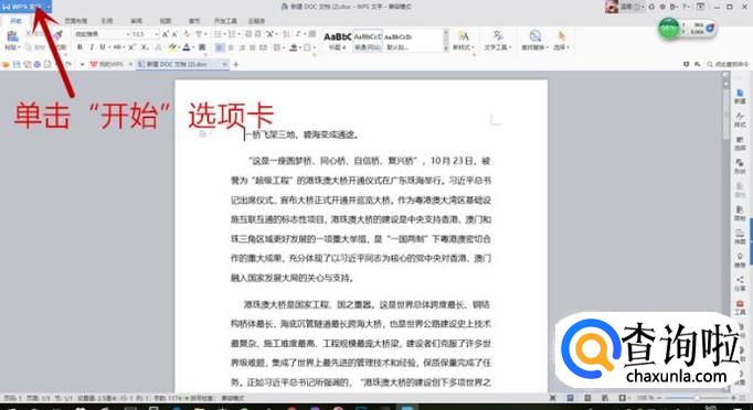 单击在打开的word文档左上角的“开始”选项卡。