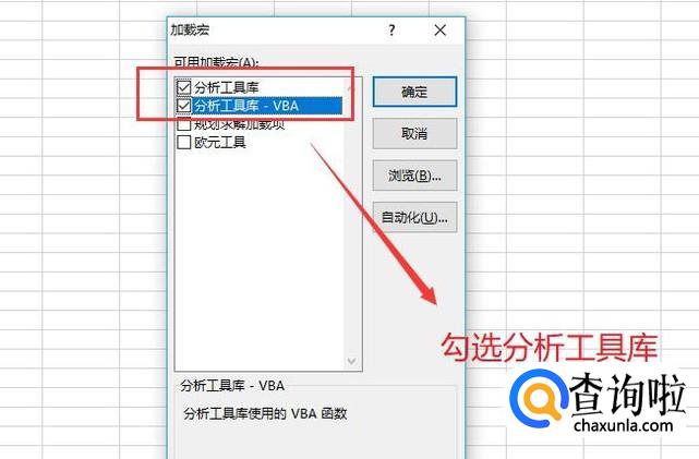 接着在弹出的加载宏界面中勾选分析工具库,如下图所示
