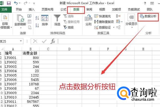 接下来回到Excel界面,点击数据菜单,然后点击下面的数据分析按钮,如下图所示