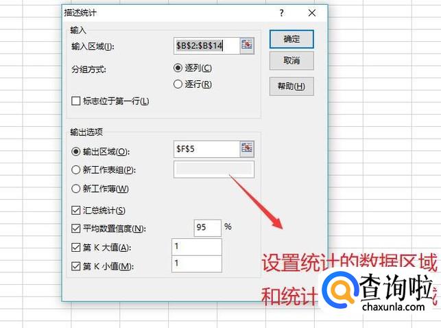 然后会弹出描述统计的设置界面,我们设置要统计的数据区域和结果输出区域,如下图所示