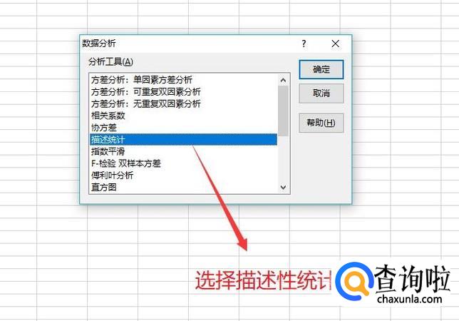 在弹出的数据分析界面中选择描述统计选项,如下图所示