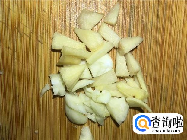 姜去掉姜片,切碎;蒜头用刀子拍扁,去掉外衣,切碎。