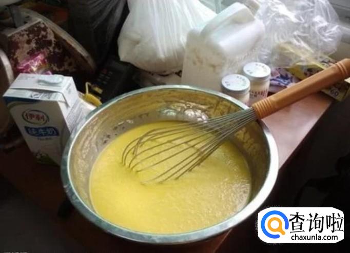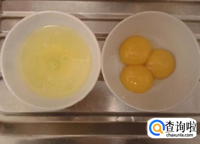 将鸡蛋的蛋清和蛋黄分开,蛋清里面加一点白糖,蛋黄里面加入色拉油和牛奶。