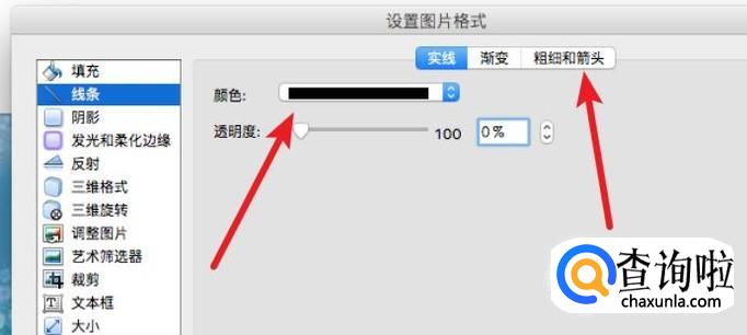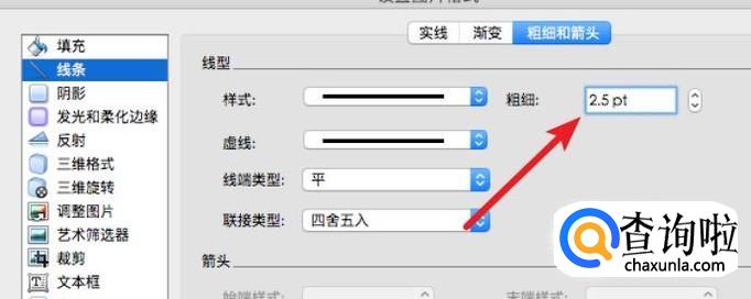 在左边选中线条,然后选择线条的颜色,再点击‘粗细和箭头’。