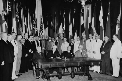 联合国(拼音:Lián hé guó;英语:United Nations;法语:Organisation des Nations Unies;西班牙语:Organización de las Naciones Unidas、Naciones Unidas;俄语:Организация Объединённых Наций;阿拉伯语:الأمم المتحدة)是第二次世界大战后成立的国际组织,是一个由主权国家组成的国际组织。1945年10月24日,在美国旧金山签订生效的《联合国宪章》,标志着联合国正式成立。联合国致力于促进各国在国际法、国际安全、经济发展、社会进步、人权及实现世界和平方面的合作。