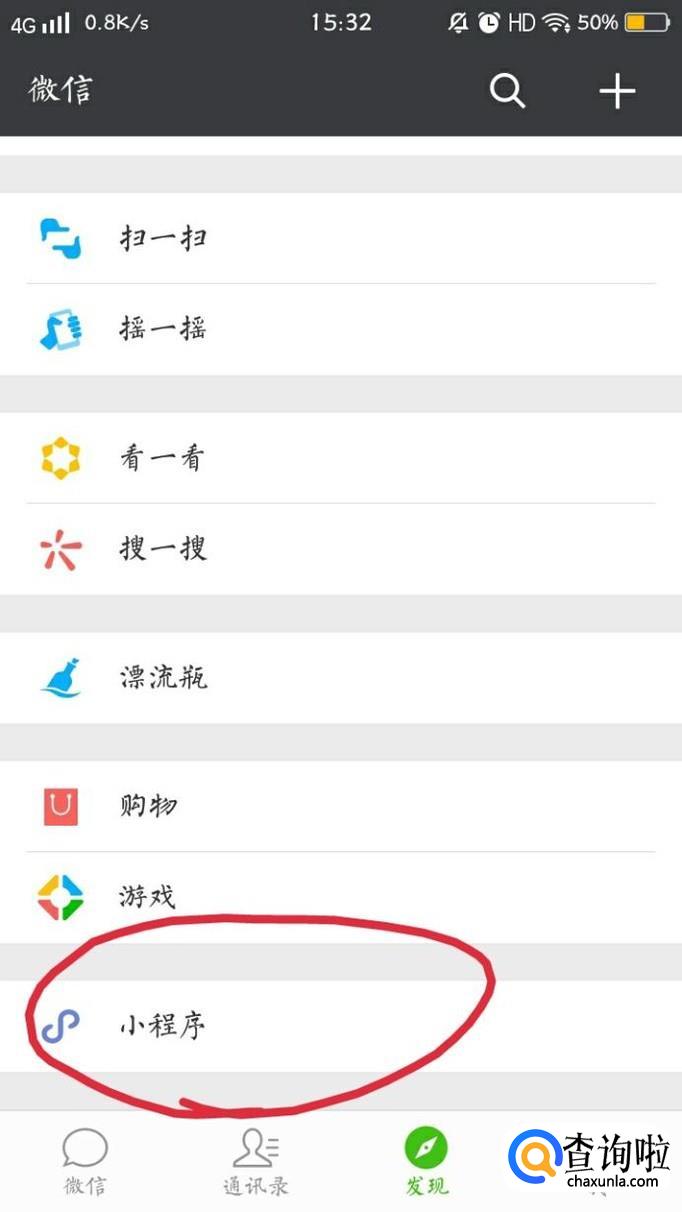 首先打开微信,选择“发现”,然后点击“小程序”。如下图所示。
