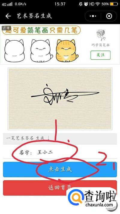 在名字输入栏输入自己的名字,如“王小二”,然后点击生成。如下图所示。