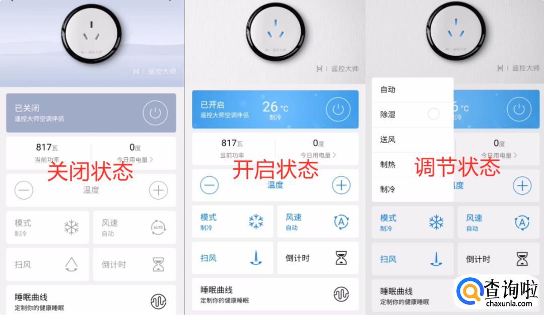 空调伴侣设备连接完毕之后,需要添加上家中的空调的品牌,进而进行控制。连接成功后我们可以在控制界面看到各项功能:主要有空调的开启/关闭、当前功率、用电计量、温度调节、多种模式调节。