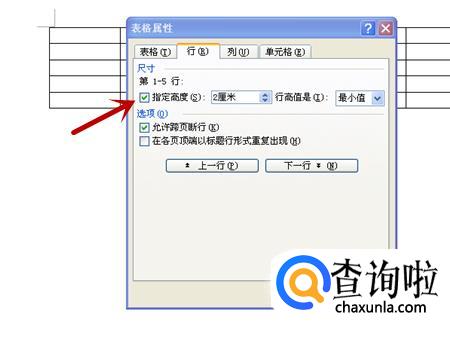 在表格属性设置框中,点击行按钮,在指定高度处设置自己想要的行高。