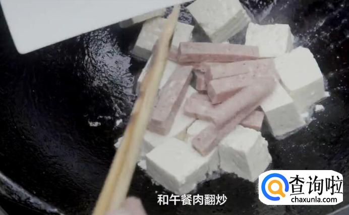 热锅起油,倒入豆腐块和午餐肉翻炒。