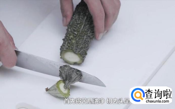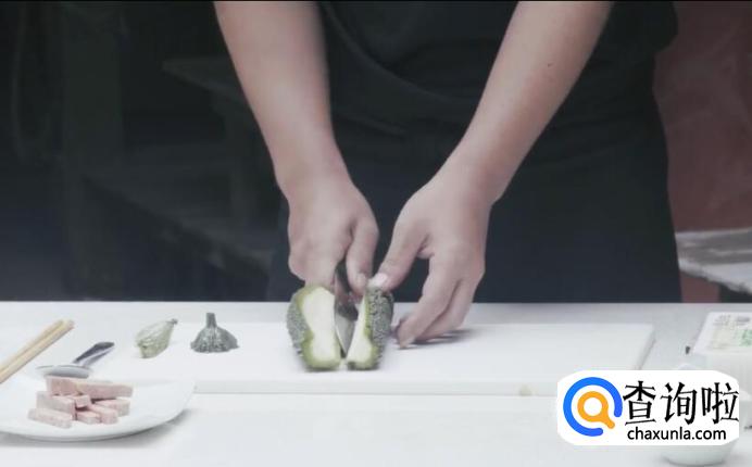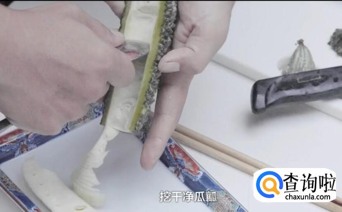 对半剖开,挖干净瓜瓤,以减少苦味。