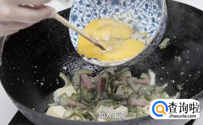 调味结束后,加入蛋液,翻炒两三回至均匀,即可出锅。