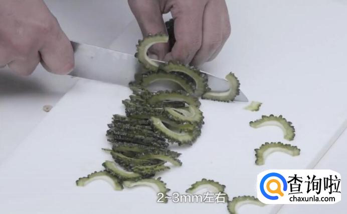 将苦瓜放入滚油中,稍稍炸一下,迅速捞出以便保持苦瓜新鲜的颜色,。
